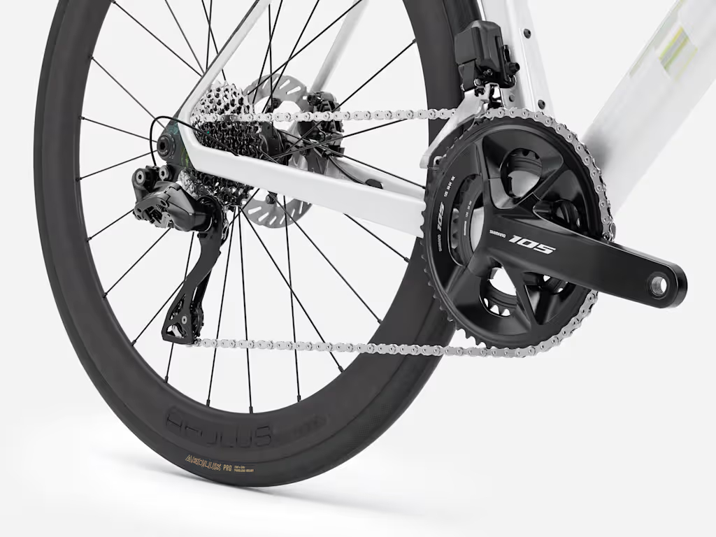 Madone SL 6 Gen 8は、SLRシリーズよりも手頃な価格となるOCLV 500カーボンレイアップを採用し、トップレベルの技術を低価格で実現した軽量エアロロードバイク。シマノ105 Di2の電動コンポーネントはすばやい電動変速を実現し、アルミハンドルバーと組み合わせて価格を抑えています。さらにカーボンホイールを採用した軽さもその性能のひとつ。