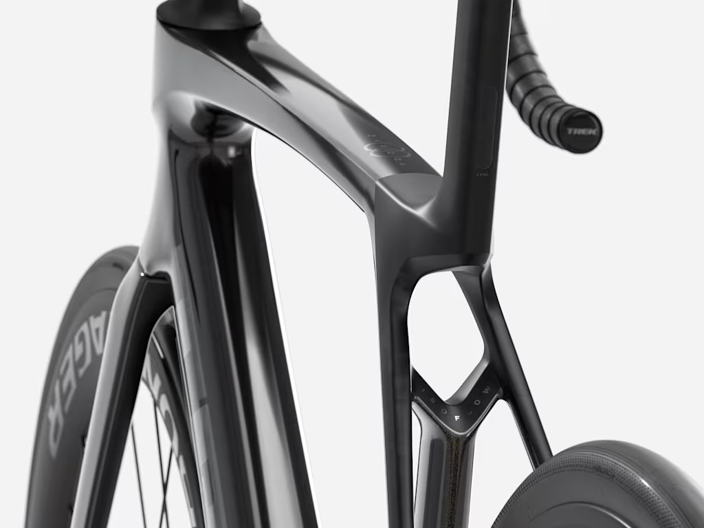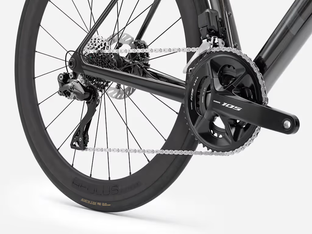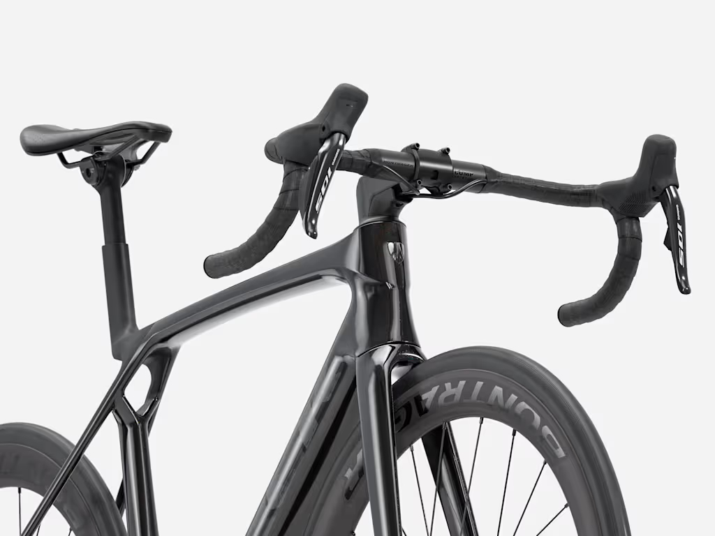 Madone SL 6 Gen 8は、SLRシリーズよりも手頃な価格となるOCLV 500カーボンレイアップを採用し、トップレベルの技術を低価格で実現した軽量エアロロードバイク。シマノ105 Di2の電動コンポーネントはすばやい電動変速を実現し、アルミハンドルバーと組み合わせて価格を抑えています。さらにカーボンホイールを採用した軽さもその性能のひとつ。